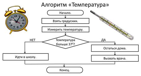 А бывает такое, что будильник уже звенит, а вставать ну-у совсем не хочется, но надо? А иногда бывает такое, что причина этому высокая температура. Но, чтобы узнать необходимо температуру измерить. А давайте составим алгоритм «Температура».