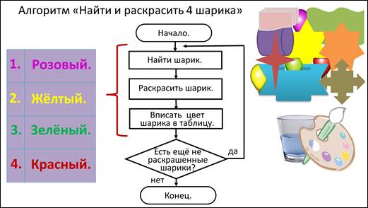Необходимо среди всех геометрических фигур найти 4 воздушных шарика, раскрасить их и записать в табличку цвет каждого раскрашенного шарика. А ещё составить алгоритм «Найти и раскрасить 4 шарика».