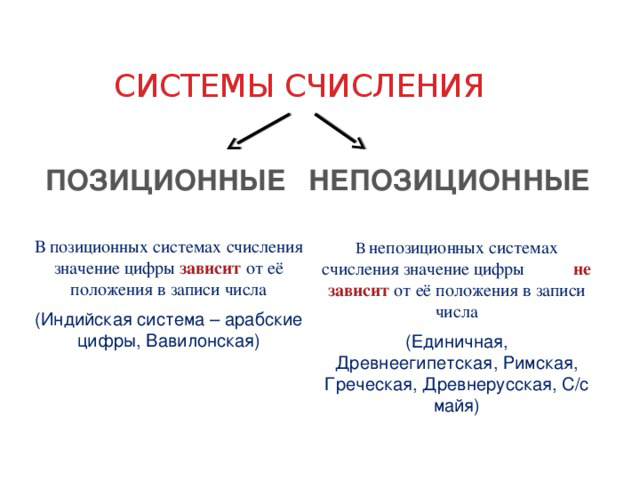 В позиционных системах счисления значение цифры зависит от её положения в записи числа (Индийская система – арабские цифры, Вавилонская) В непозиционных системах счисления значение цифры не зависит от её положения в записи числа (Единичная, Древнеегипетская, Римская, Греческая, Древнерусская, С/с майя)