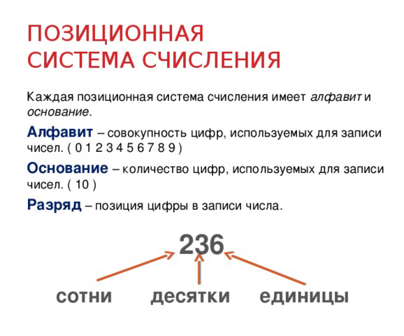 ПОЗИЦИОННАЯ СИСТЕМА СЧИСЛЕНИЯ Каждая позиционная система счисления имеет алфавит и основание . Алфавит – совокупность цифр, используемых для записи чисел. ( 0 1 2 3 4 5 6 7 8 9 ) Основание – количество цифр, используемых для записи чисел. ( 10 ) Разряд – позиция цифры в записи числа. 236 сотни десятки единицы