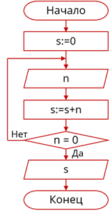 Составим блок-схему алгоритма решения этой задачи. Обозначим s – сумму чисел. В начале она должна быть равна 0. Присвоим ей это значение. Далее пользователь введёт с клавиатуры значение слагаемого, обозначим его n. После этого программа увеличит значение суммы на текущее слагаемое. Далее с помощью условного блока проверим, равно ли введённое слагаемое нулю. Если условие не выполняется, значит снова вернёмся к считыванию очередного слагаемого. Если же очередное слагаемое равно нулю, выведем на экран итоговое значение суммы. На этом программа завершит свою работу.