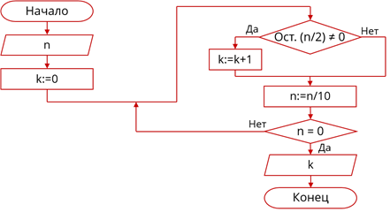 Составим блок-схему алгоритма решения задачи. Сначала пользователь вводит с клавиатуры число, обозначим его n. Обозначим k количество нечётных цифр. Так как мы их ещё не считали присвоим k значение ноль. Дальше будут следовать условный оператор, который будет проверять, является ли нечётной последняя цифра числа, но так как чётность или нечётность числа зависит от чётности или нечётности его последней цифры нам достаточно проверить, не равен ли 0 остаток от деления всего числа n на 2. Если условие выполняется, увеличим значение k на 1. В противном случае ничего делать не будем. Теперь нужно отбросить последнюю цифру числа, так как её чётность мы уже проверили. Для этого достаточно n без остатка разделить на 10. Теперь с помощью ветвления проверим равно ли число 0, если нет – вернёмся к проверке чётности его последней цифры. Когда мы проверим все цифры числа, переменная n станет равна 0 и нам останется лишь вывести на экран значение k. На этом работа нашей программы будет завершена.