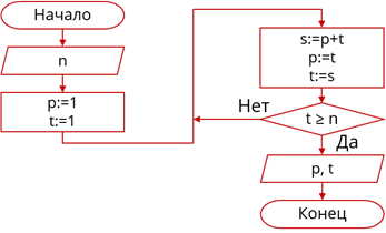 Составим блок-схему алгоритма решения задачи. В начале пользователь вводит с клавиатуры значение n. Нам известны первые 2 члена ряда Фибоначчи, назовём их текущий и предыдущий и обозначим t и p соответственно. В начале оба они равны единице. Присвоим им соответствующее значение. Дальше будем генерировать следующие члены ряда. В начале вычислим сумму известных членов ряда и сохраним её в промежуточной переменной s. Это будет следующий член ряда. Так, как значение предыдущего члена ряда больше не нужно – присвоим переменной p значение t, а t – значение s. Теперь проверим условие: t>n. Если нет – сгенерируем следующий член ряда, то есть вернёмся к блоку присваивания s суммы p и t. Если же условие выполняется – выведем на экран значения p и t. На этом работа программы будет завершена.