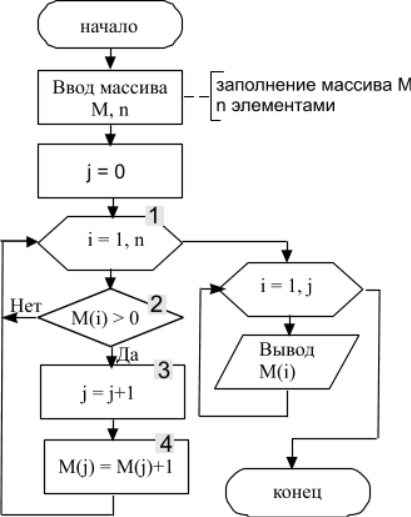 Т. о., индекс вводимого элемента изменяется от 1 до N с шагом 1. Очевидно, что для реализации ввода массива необходимо выбрать структуру цикла. Блок-схема ввода массива представлена на рис. 3.