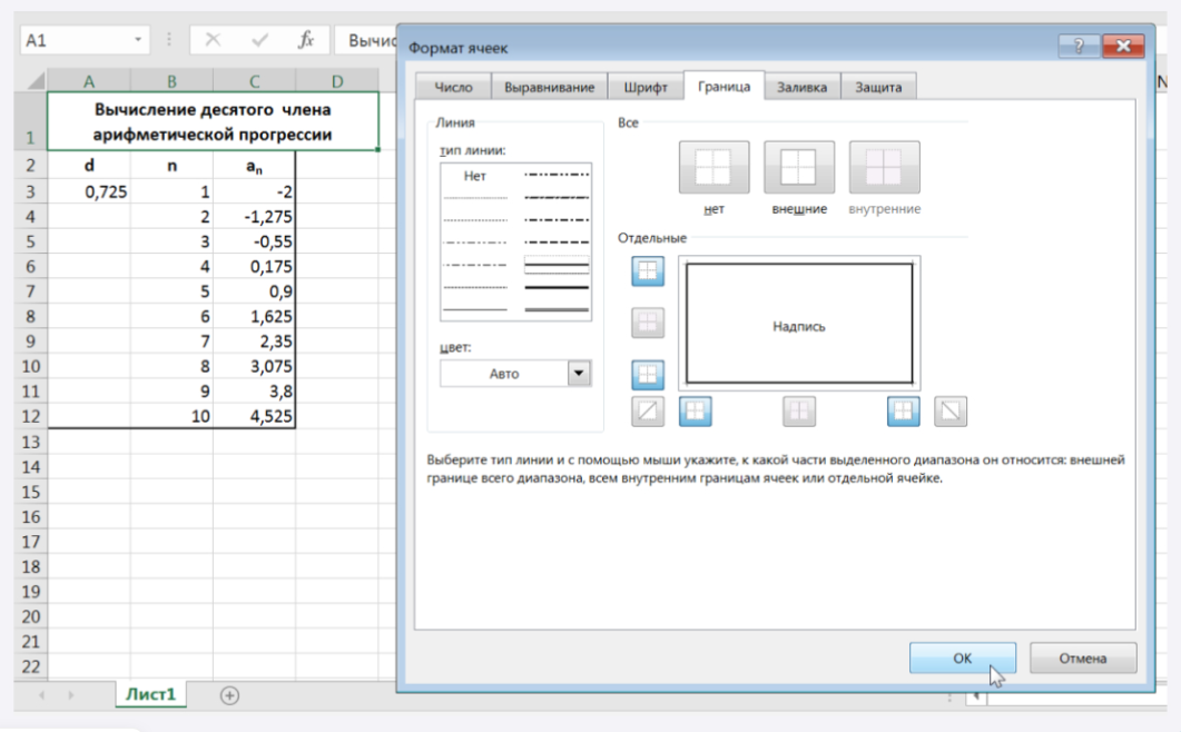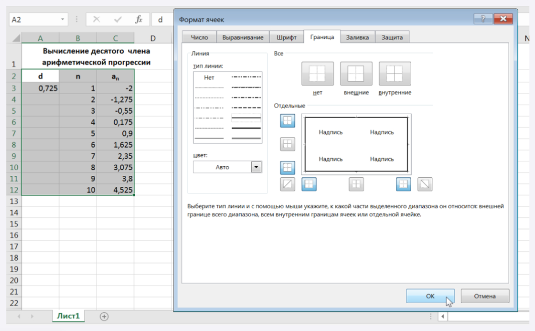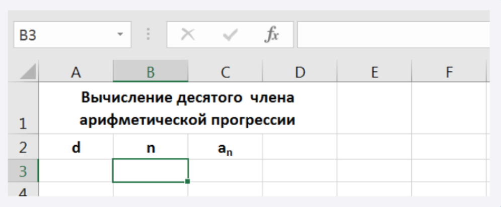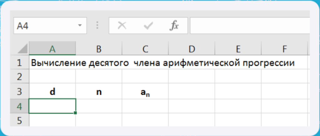 В ячейку A3 введите d, в В3 — n, в С3 — an. Размер шрифта 11 п., выравнивание по центру, применить полужирный стиль начертания символов. Для набора нижних индексов воспользоваться командой Формат\Ячейки, выбрать вкладку Шрифт\Нижний_индекс.