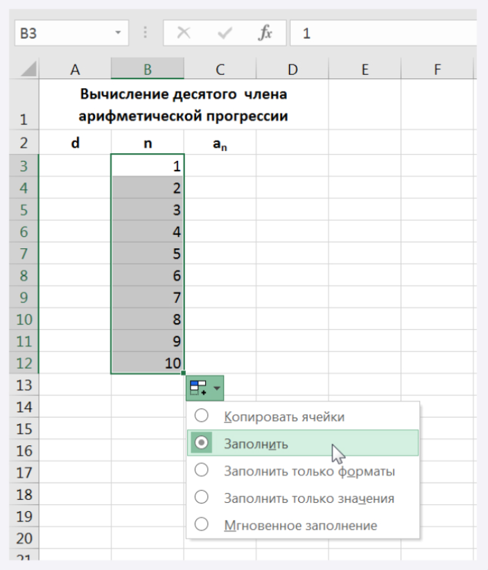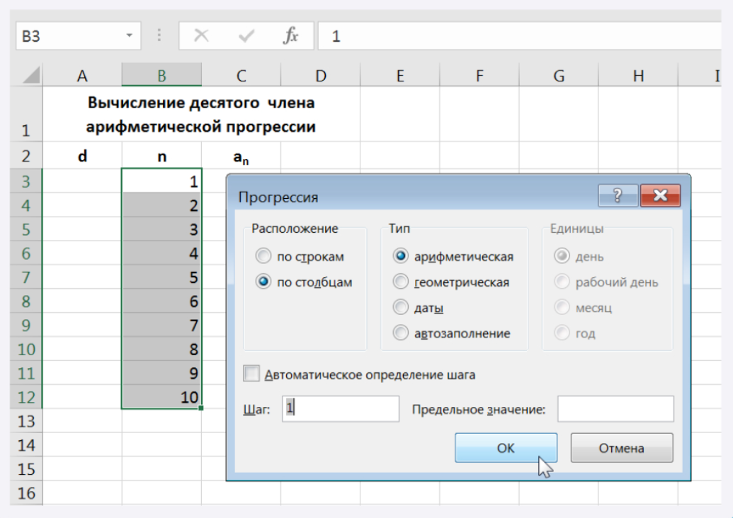 Или: ввести в ячейку В3 число 1 Выделить блок, который надо заполнить. Выбрать команду Редактирование\Заполнить\Прогрессия. Выбрать необходимые параметры.