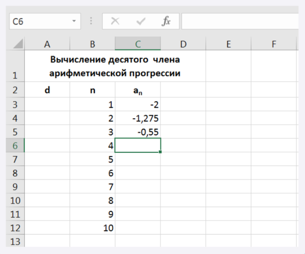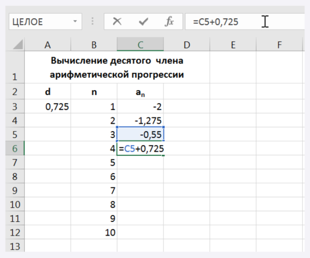 Далее надо вычислить оставшиеся члены прогрессии. Для этого в выделенной ячейке С6 записываем формулу = С5 + 0,725. Установить курсор мыши в правый нижний угол ячейки. Когда курсор примет форму черного крестика (маркер заполнения), нажать на левую кнопку мыши, протянуть маркер заполнения на несколько ячеек вниз.