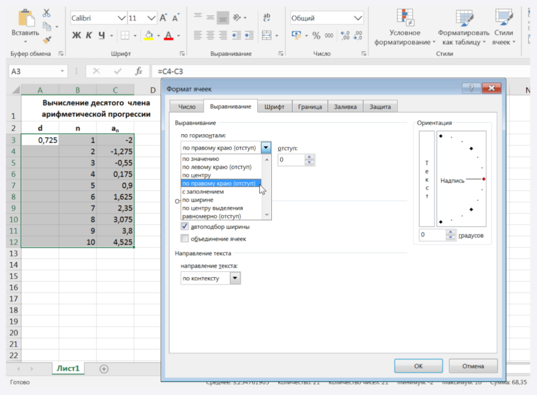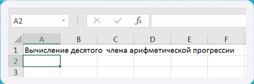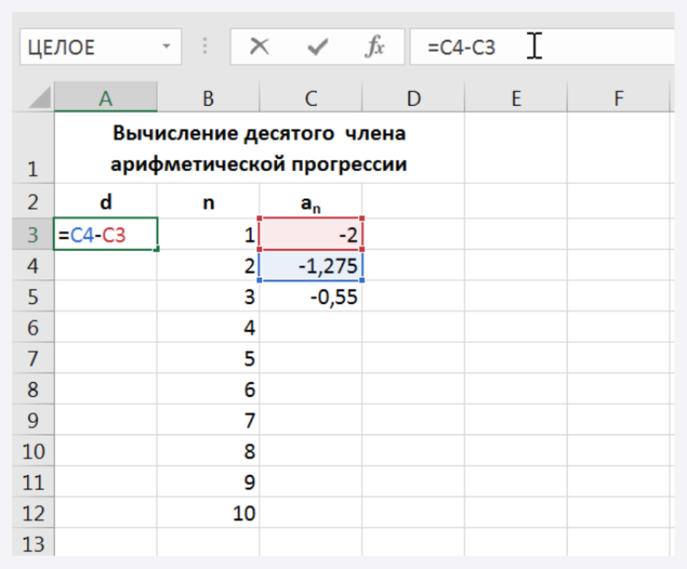В ячейку А3 ввести формулу разности арифметической прогрессии. Нужно из второго члена прогрессии вычесть первый. Помним, что запись формулы начинается со знака равно.
