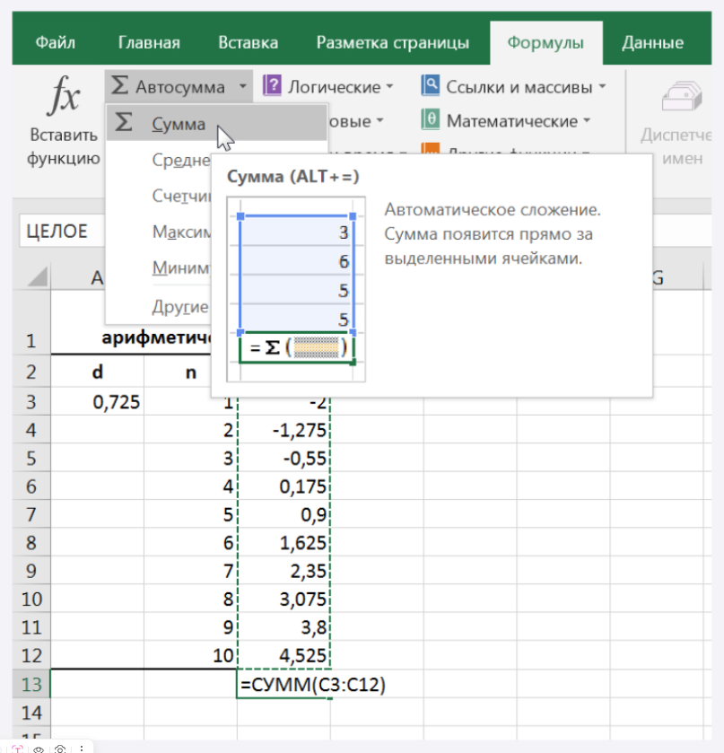 Вычислить сумму полученных членов прогрессии. Выделить диапазон С3:С12. Затем использовать меню Редактирование\Автосумма вкладка Сумма. В ячейке С13 появиться результат суммирования.