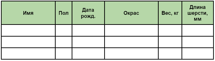 Теперь передвинем границы столбцов. Чтобы сделать столбец Имя пошире, а Пол поуже, поместим указатель мыши на границу между ними. Указатель изменится, намекая, что теперь границу можно буксировать. Перетащим её туда, куда нужно. Так же поступим с остальными столбцами. Теперь наша таблица готова к заполнению.