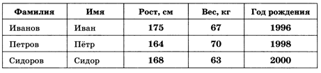 Табличные модели удобно использовать тогда, когда нужно в наглядной форме представить информацию об объектах, имеющих одинаковый набор свойств (таблицы «объект — свойство»). Например, в следующей таблице элементы в каждой строке связаны между собой — это свойства некоторого объекта (человека) — табл. 3.1.