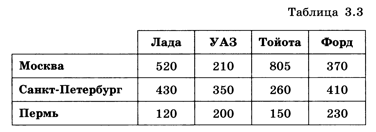 Таблица может определять отношения между объектами (таблица «объект—объект»). Например, в табл. 3.3 показано, сколько и каких автомобилей сумела продать компания в разных городах.