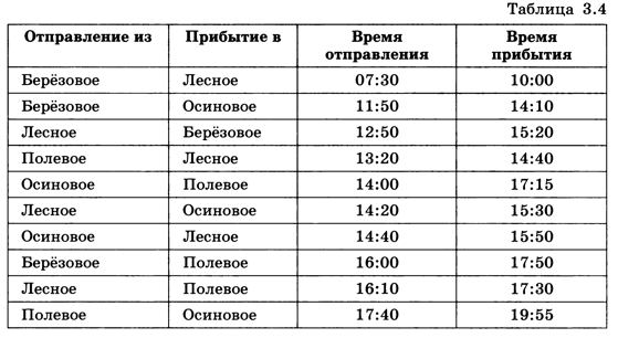 Рассмотрим задачу, которая требует анализа табличных данных: определение оптимального (самого лучшего) маршрута поездки. Задача. Путешественник прибыл в посёлок Берёзовое в 8 утра по местному времени и увидел следующее расписание автобусов (табл. 3.4).