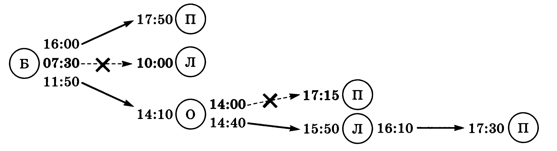 Определите самое раннее время, когда он может попасть в посёлок Полевое, и как ему нужно ехать. Из расписания видно, что автобусы ходят между четырьмя населёнными пунктами. Нарисуем схему, показывающую все возможные способы переезда из посёлка Березовое в посёлок Полевое. Буквы в кружках обозначают посёлки (Б — Берёзовое, П — Полевое, Л — Лесное и О — Осиновое), а слева и справа от них записано время отправления и прибытия автобусов согласно расписанию (рис. 3.3).