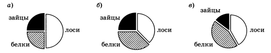 Какая из диаграмм на рис. 3.5 правильно отражает соотношение общего числа животных разных видов по всему заповеднику?