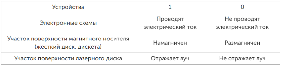 Двоичное число, которое представляет наименьшую единицу информации, называется бит. Бит может принимать значение либо 0, либо 1. Наличие магнитного или электронного сигнала в компьютере означает 1, отсутствие 0.