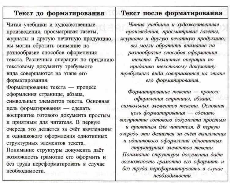 Существуют форматированные и неформатированные тексты. На изображении приведены два текста одного и того же содержания, но первый — неформатированный, а второй — форматированный.