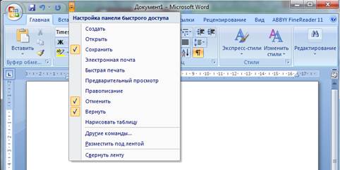Рассмотрим основные элементы текстового процессора Microsoft Word. Начнем с панели быстрого доступа (рис. 3). На этой панели отображаются кнопки различных команд. Команды можно добавлять и удалять, для этого нужно нажать на стрелочку (рис. 3(1)). По нажатию на стрелочку открывается Настройка панели быстрого доступа (рис. 4). Нажимая ЛКМ на названия кнопок, можно их убирать или добавлять.