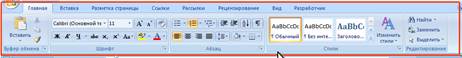 Лента панелей инструментов (рис. 5) представляет собой семь постоянных стандартных вкладок (Главная, Вставка, Разметка страницы, Ссылки, Рассылки, Рецензирование, Вид).