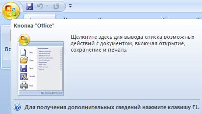 Также вы можете увидеть кнопку Office (рис. 6). В этой кнопке содержатся основные команды (например, Открыть, Создать, Сохранить, Печать и другие).