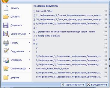 Первая кнопка — кнопка Office (рис. 10). Она является главной кнопкой. По нажатию раскрывается меню, где есть команды Создать, Открыть, Сохранить, Печать и другие (рис. 11).