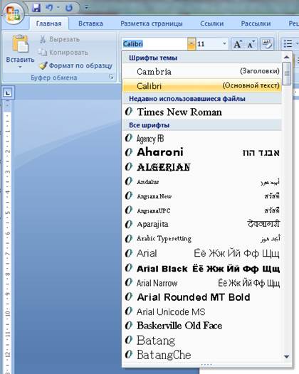 2. В раскрывающемся списке Шрифт выбрать шрифт. При наведении указателя мыши на выбираемый шрифт фрагмент документа отображается указанным шрифтом.