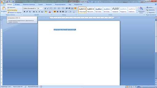 2. Наберем с клавиатуры фразу: «Я изучаю текстовый процессор» (рис. 14), выделим ее и нажмем команду Копировать.