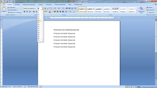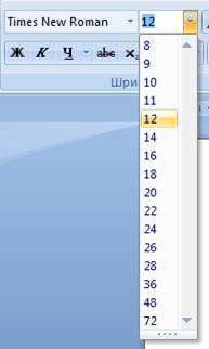 Установить размер шрифта можно нажатием на стрелочку. По нажатию появляется список размеров шрифтов (рис. 24), или можно самостоятельно ввести размер в поле.