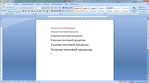 5. Выделяем вторую строку и устанавливаем размер 16 пунктов, третью — 18, четвертую — 20, пятую — 22, шестую — 24. (рис. 17).