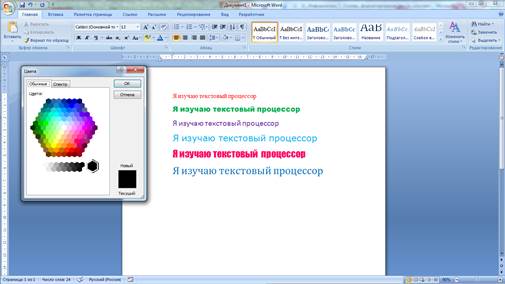 8. Изменим цвет. Выделяем фразу и устанавливаем цвет. Первой строке — красный, второй — зеленый, третьей — фиолетовый, четвертой — голубой, пятой — розовый, шестой – синий (рис. 20).