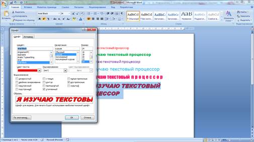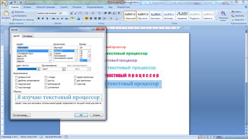 В данном окне можно изменить шрифт, начертание, размер, цвет текста, а также видоизменять фрагмент текста.