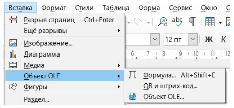 - Вставка формул. Меню «Вставка» → «Формула» (Microsoft Word, LibreOffice Writer). Использование базовых математических выражений: дробей, степеней, корней, греческих букв, математических операций.